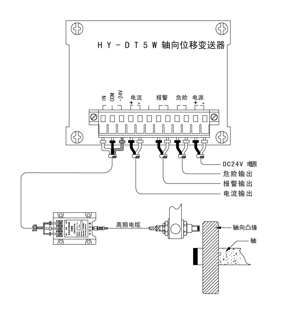 HY - DT5系列位移变送器配合CWY - DO电涡流传感器,主要测量各类旋转机械的轴向位移和胀差,输出标准的4~20 mA电流信号,送给PLC、DCS 系统,并带液晶显示功能。
