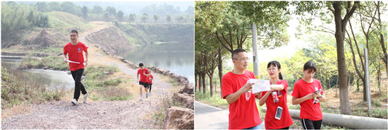 首先进行的是一项新兴户外运动—定向越野挑战赛,这不仅需要有充沛的体能,跑遍景区每个角落打卡12个计时点,而且只能依靠地图、指南针在完全陌生的景区树林中搜索打卡点。全程完赛微信步数达到1万步,相当于跑了10公里山路。这比赛强度不是专业运动员才能胜任吗?我们的队员能完成吗?事实完全击碎了赛前的质疑,我们的队员全部在一个半小时内完成了挑战,最快时间只用了三十一分钟,你们穿过荆棘,轻伤不下火线,你们合理运用规则,研究最优路线,简直是力量与智慧的化身,连教练都由衷为你们点赞。